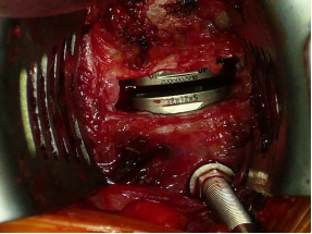 - Sau khi lấy bỏ sạch đĩa đệm, dây chằng dọc trước, gai xương, tiến hành đặt đĩa đệm cổ bằng dụng cụ chuyên dụng.