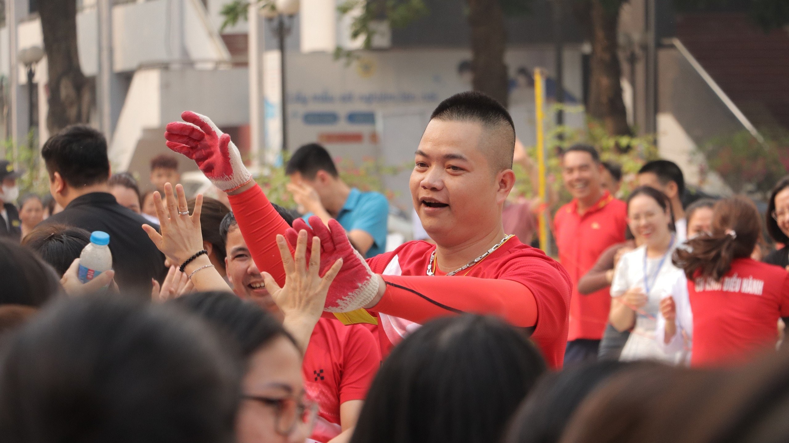 Vận động viên chủ lực của khối Điều hành ăn mừng cùng cổ động viên sau khi giành chiến thắng