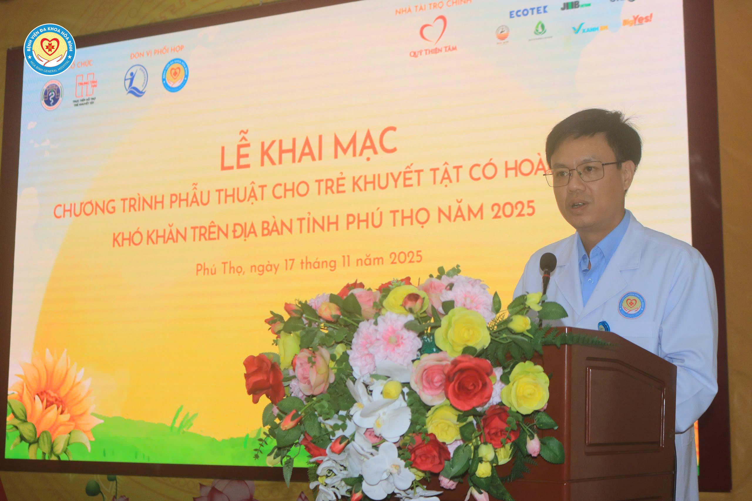 Ngày 17/11, tại Bệnh viện Đa khoa Hoà Bình đã tổ chức khai mạc Chương trình khám và hội chẩn phẫu thuật cho trẻ em khuyết tật trên địa bàn khu vực Hoà Bình. Tham dự chương trình có ông Đồng Văn An, Giám đốc Trung tâm II; ông Lý Minh Tuấn, Giám đốc Quỹ Thiện tâm thuộc Tập đoàn Vingroup; Bà Cao Đào, Giám đốc Công ty Cổ phần truyền thông và dịch vụ JMB; TS.BS Nguyễn Hồng Đặng, Trưởng khoa Ngoại 11 Bỏng tạo hình, Bệnh viện Hữu Nghị Việt Tiệp; TS.BS Trương Như Hiển, Phó Giám đốc Bệnh viện Đa khoa Hoà Bình cùng đông đảo các chuyên gia, thành viên đoàn các đơn vị đồng hành và trẻ em cùng người nhà đến khám và dự chương trình.