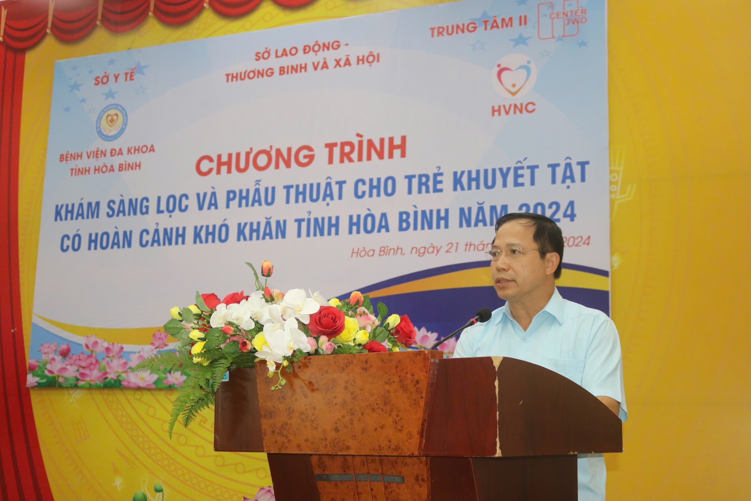 Phát biểu tại chương trình, đồng chí Nguyễn Văn Toàn, Phó Chủ tịch Thường trực UBND tỉnh đánh giá cao ý nghĩa nhân văn của chương trình. Qua chương trình đã thể hiện sự quan tâm sâu sắc của cộng đồng và xã hội với trẻ em, trẻ khuyết tật. Các em được tạo điều kiện tiếp cận với các dịch vụ y tế chất lượng cao, đảm bảo chủ trương của Đảng, Nhà nước về chăm sóc, giáo dục và bảo vệ trẻ em, đáp ứng yêu cầu phát triển đất nước. Chương trình đã đem đến cơ hội điều trị cho trẻ em khuyết tật tỉnh Hòa Bình để các em được phát triển toàn diện và nâng cao giá trị cuộc sống. Đồng chí Phó Chủ tịch Thường trực UBND ghi nhận và biểu dương sự phối hợp tích cực của Sở lao động – Thương binh và Xã hội, Bệnh viện Đa khoa tỉnh và Trung tâm II. Để chương trình được thực hiện hiệu quả trong năm 2024, đồng chí Phó Chủ tịch Thường trực UBND đề nghị Bệnh viện Đa khoa tỉnh chuẩn bị tốt cơ sở vật chất, trang thiết bị y tế, đội ngũ y bác sĩ để phẫu thuật và phục vụ chương trình, hỗ trợ thủ tục để đảm bảo các quyền lợi cho trẻ đến khám và phẫu thuật. Đồng chí cũng đề nghị các chuyên gia y tế quan tâm, hướng dẫn, trợ giúp kỹ thuật cho đội ngũ các bác sĩ của Bệnh viện tỉnh trong thời gian thực hiện phẫu thuật và chăm sóc sau phẫu thuật cho trẻ. Qua đây, đồng chí Phó Chủ tịch Thường trực UBND cũng gửi lời cảm ơn tới các chuyên gia y tế, lãnh đạo và cán bộ Trung tâm II, các nhà tài trợ, lãnh đạo và đội ngũ y, bác sĩ Bệnh viện Đa khoa tỉnh đã tạo điều kiện triển khai chương trình.