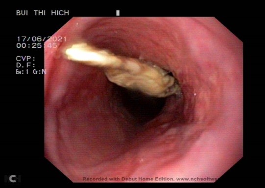 Qua thăm khám lâm sàng, chụp Xquang, các bác sĩ xác định có dị vật mắc ở thực quản đoạn cổ và ngực. Kíp thực hiện can thiệp chính gồm Bs.CKI Nguyễn Thị Thanh Hảo, phó trưởng khoa Nội Tổng hợp và các thành viên đã thực hiện tiến hành thủ thuật nội soi can thiệp gắp dị vật. Kìm chuyên dụng được sử dụng để gắp dị vật nhanh chóng sau 10 phút. Dị vật là mảnh xương gà lẫn thịt có hình tam giác, kích thước 2x1,5x1,5 cm, dị vật có 2 đầu nhọn, cắm vào thành thực quản, gây chảy máu. Sau khi gắp dị vật, nội soi kiểm tra lại thực quản có vết rách nông đoạn 1/3 trên kích thước 0,5 cm và không còn chảy máu. Người bệnh được theo dõi tại khoa khám bệnh, ổn định và ra viện trong ngày.